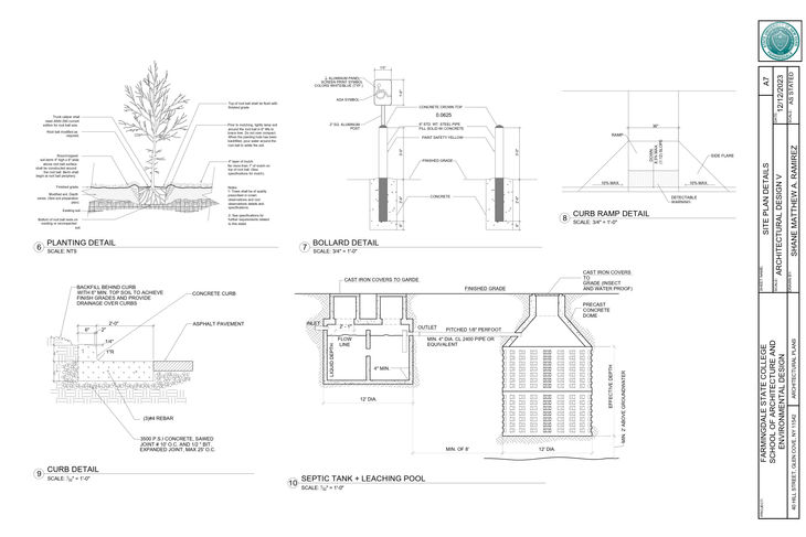 Details about the site consisting of, Demolition plan, drainage & septic plan, landscaping, site details, and proposed site plan.